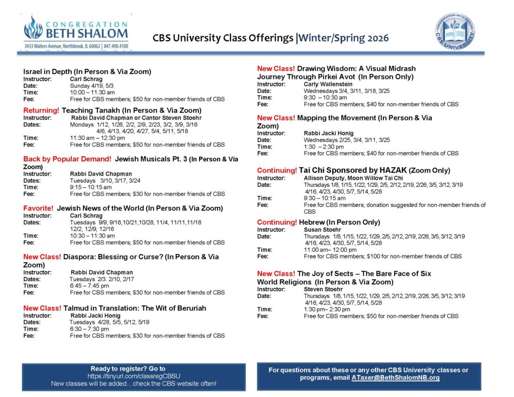 At Congregation Beth Shalom we believe that learning is a lifelong journey. Our Adult Education program called CBS Univeristy offers meaningful opportunities for exploration, growth, and connection through Jewish learning. Whether you’re deepening your knowledge of sacred texts, engaging with contemporary issues through a Jewish lens, or simply seeking community and conversation, we invite you to join us in thoughtful, enriching study.